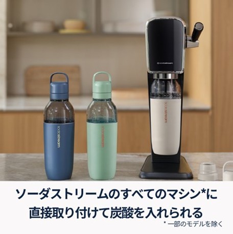 ソーダストリームの炭酸水メーカーに直接取り付けて、炭酸水を作ることが可能です。